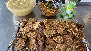Der Tag begann mit einer Kennenlernrunde bei selbstgemachter Limonade und mitgebrachten Snacks. Besonders spannend war dann das gemeinsame Kochen eines Drei-Gänge-Menüs. Unter Anleitung des Kanso-Teams, wurde in der Kochschule Biogourmetclub nicht nur fettarm, sondern auch vegan und in Bioqualität gekocht. Als Starter gab es Bruschetta, gefolgt von Gemüsebratlingen mit verschiedenen Dips, Apfelmus und selbstgemachtem Lachsersatz. Anschließend gab es zwei Desserts zur Auswahl: Zum einen ein Tiramisu mit selbstgebackenem Biskuit und einer fettarmen Kakaofüllung aus Seidentofu, sowie eine Schichtspeise aus zweierlei Fruchtmus und veganem Joghurt. Es zeigte sich, dass alle Familien bereits Koch- und Backprofis sind, also blieb beim Kochen und Zubereiten Zeit für einen regen Austausch und die Stimmung war locker und freundschaftlich. Das Essen hat allen sehr gut geschmeckt!