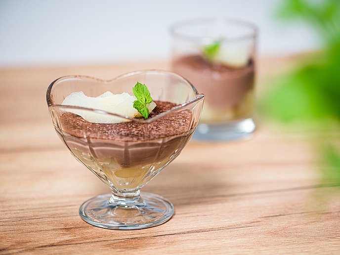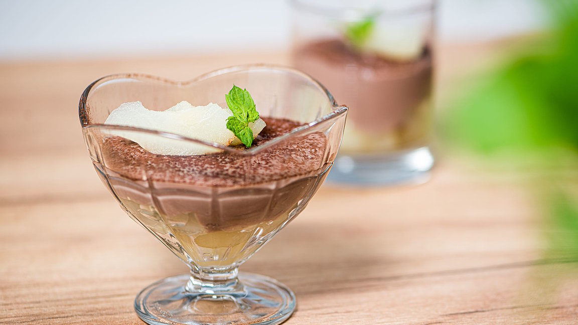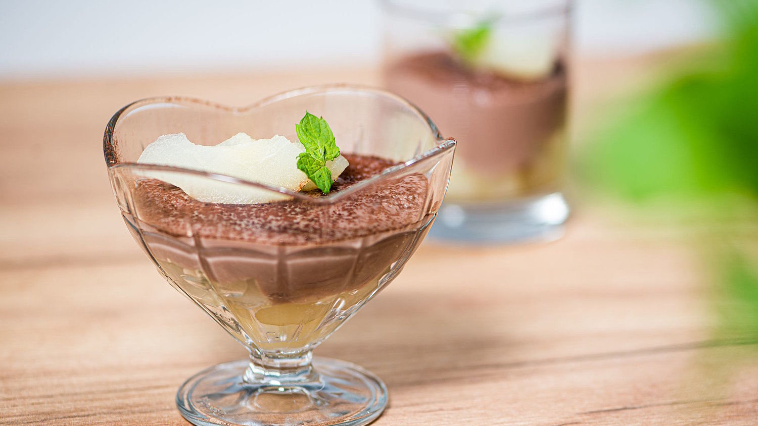 Birnenhälften mit der Wölbung nach unten in Dessertschälchen geben und den warmen Schokoladenpudding auf den Birnen verteilen.
