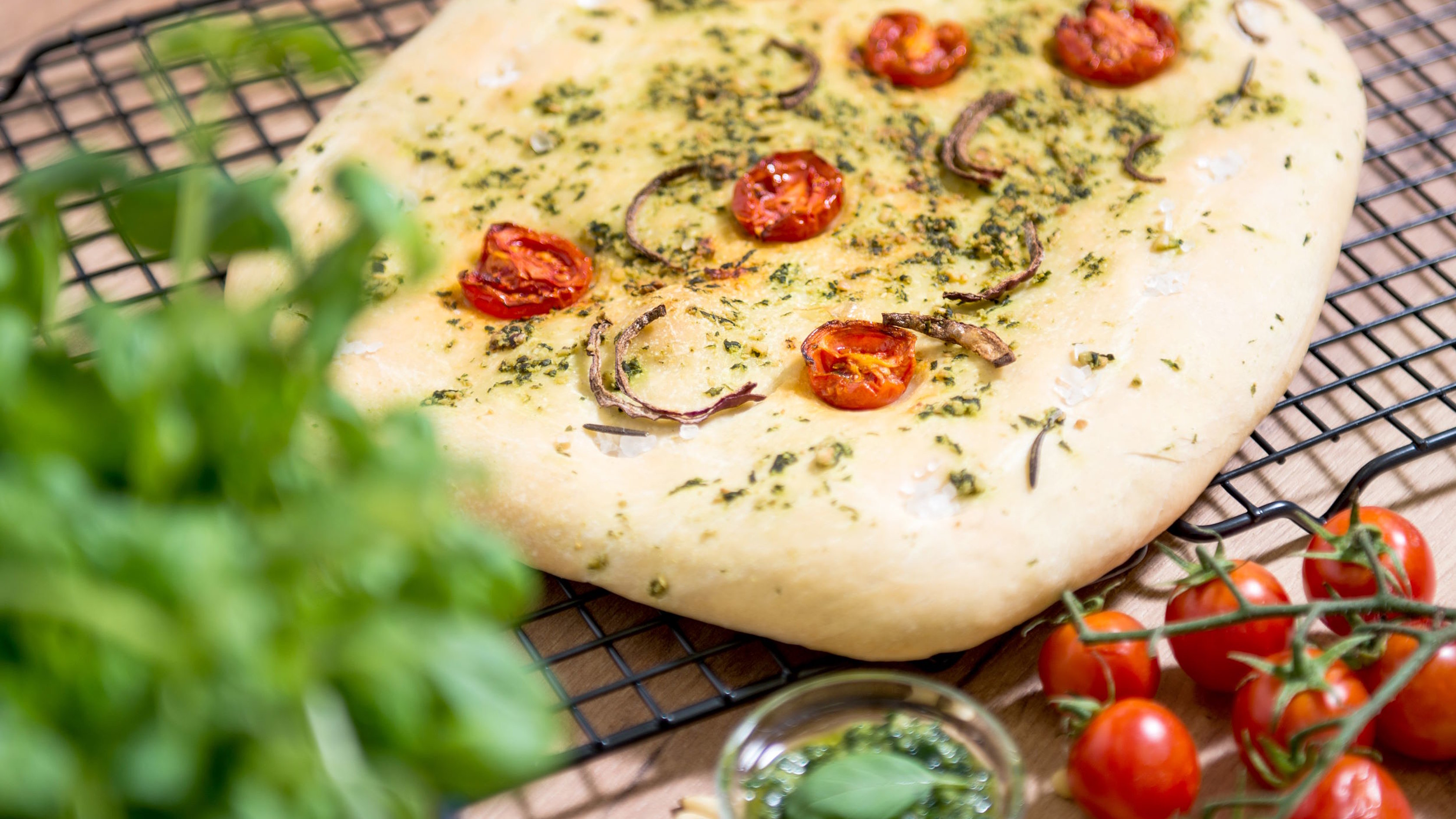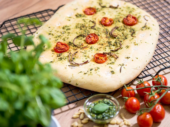 Mit einem Finger Mulden in den Teig drücken, dann mit einem halben EL MCT Öl 77 % beträufeln und mit Meersalz bestreuen. Tomaten und Rosmarin waschen, trocken schütteln. Rosmarinnadeln abzupfen und mit Kirschtomaten und Basilikum-Knoblauch Mischung auf dem Teig verteilen. Zwiebel schälen und fein schneiden.