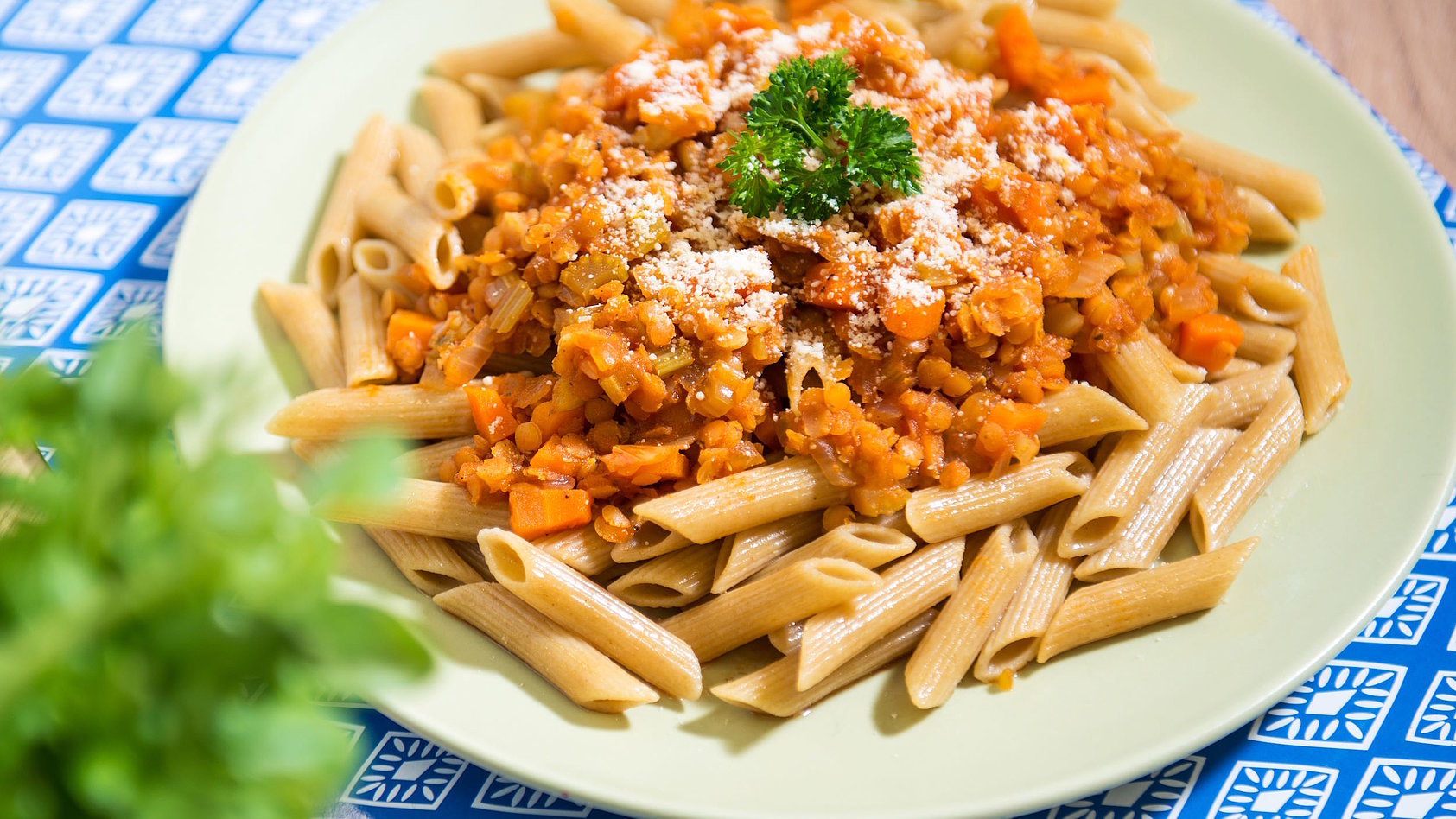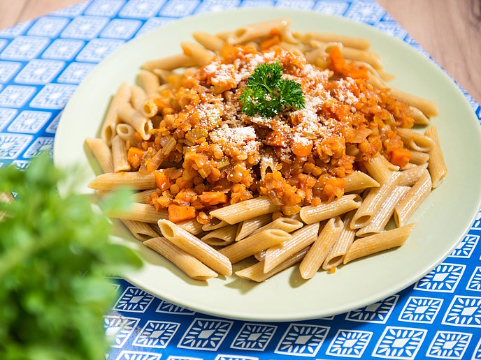 Bolognese zum Ende mit Gewürzen und Kräutern abschmecken und mit den Nudeln servieren.