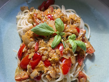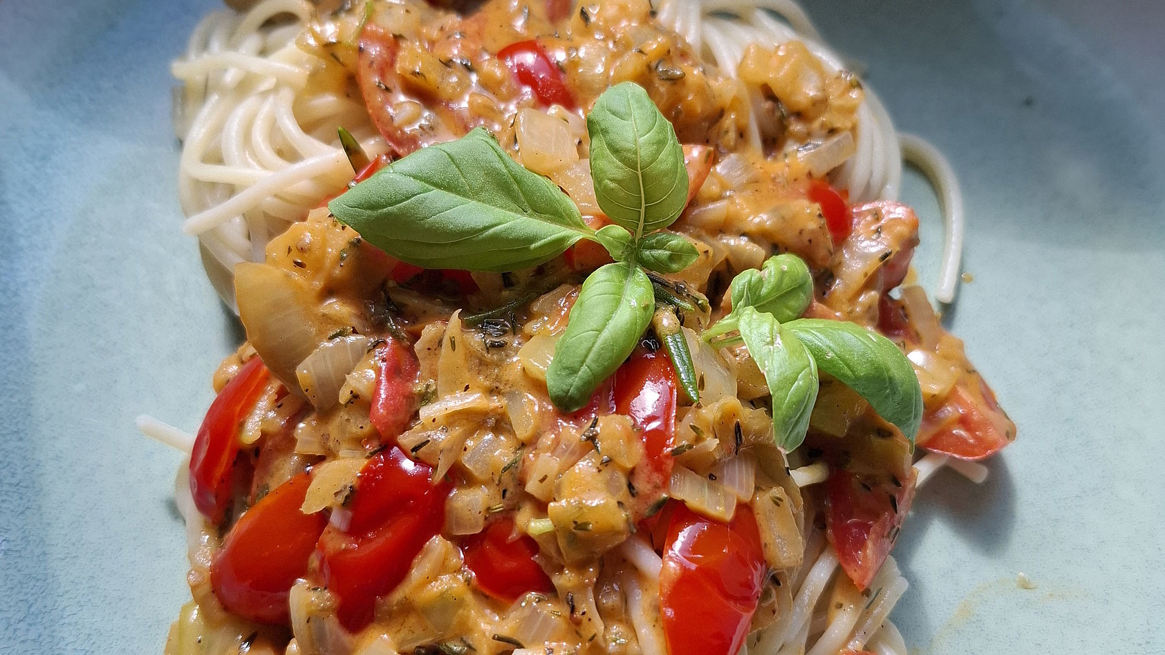 Zum Abschluss die Spaghetti mit der Soße anrichten und etwas Basilikum zur Deko verwenden.