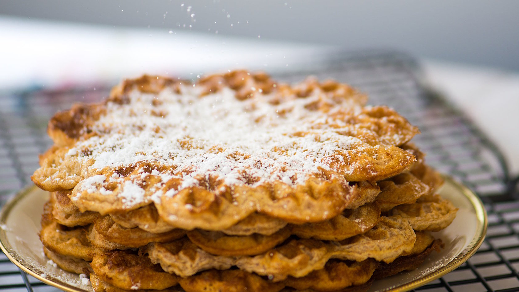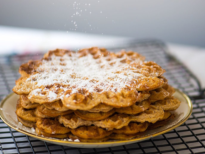 Eine Schöpfkelle voll Teig in das Waffeleisen geben und jede Waffel 4–5 Minuten backen.