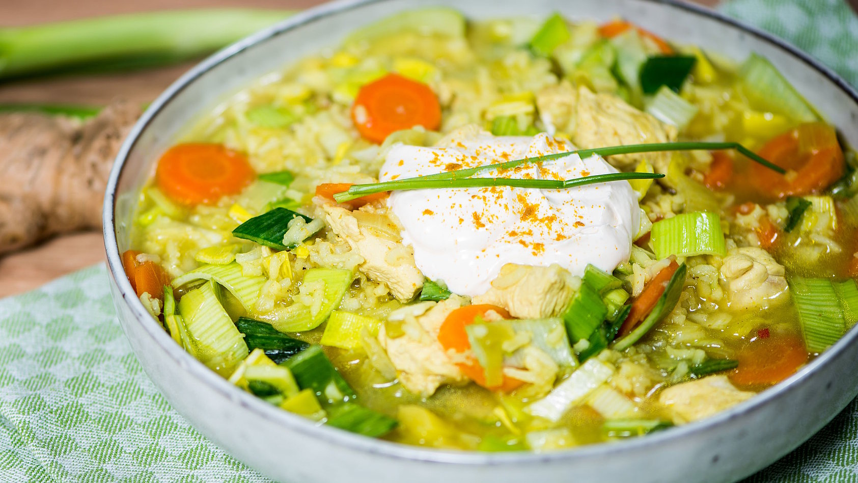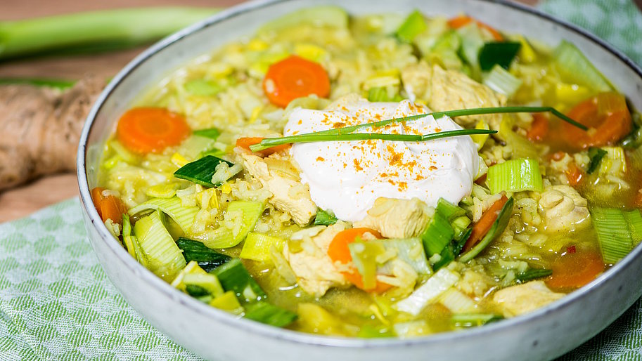 Lauch, Möhren und Hähnchenbrustfilet–Streifen in einem großen Topf im MCT Öl 77 % für einige Minuten andünsten und mit heißer Hühnerbrühe aufgießen und aufkochen lassen.