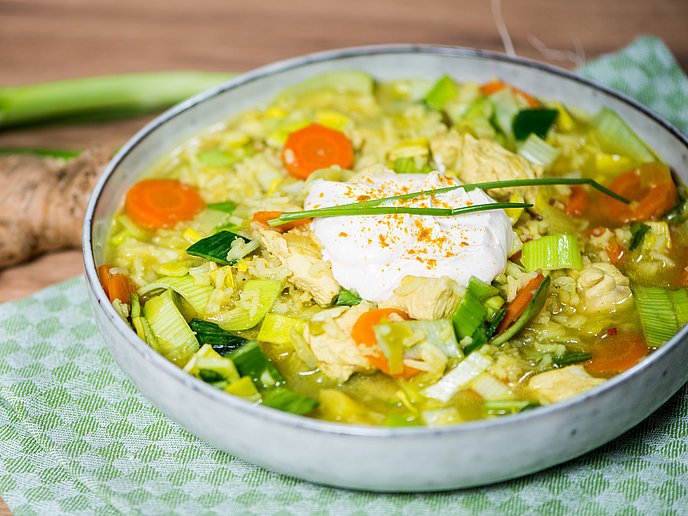 Für den Dip saure Sahne mit MCTfiber verrühren, mit Salz und Ingwerpulver würzen und zum Eintopf servieren.