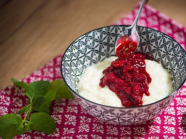 Himbeeren mit Zucker kurz aufkochen und zu /über den Milchreis geben.