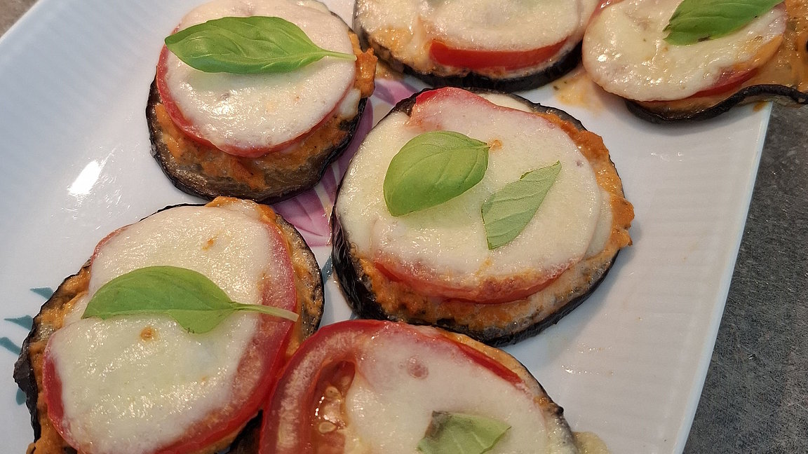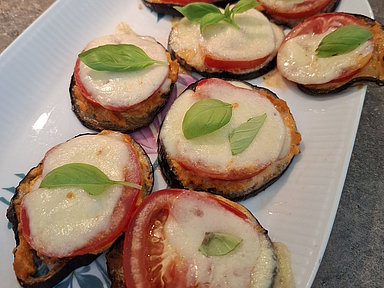 Die Auberginenscheiben aus dem Ofen holen und mit Tomato MCT Cream bestreichen. Eine Tomatenscheibe darauflegen und mit Mozzarella toppen. Alles nochmals für ca. 10 Minuten im Ofen leicht überbacken.