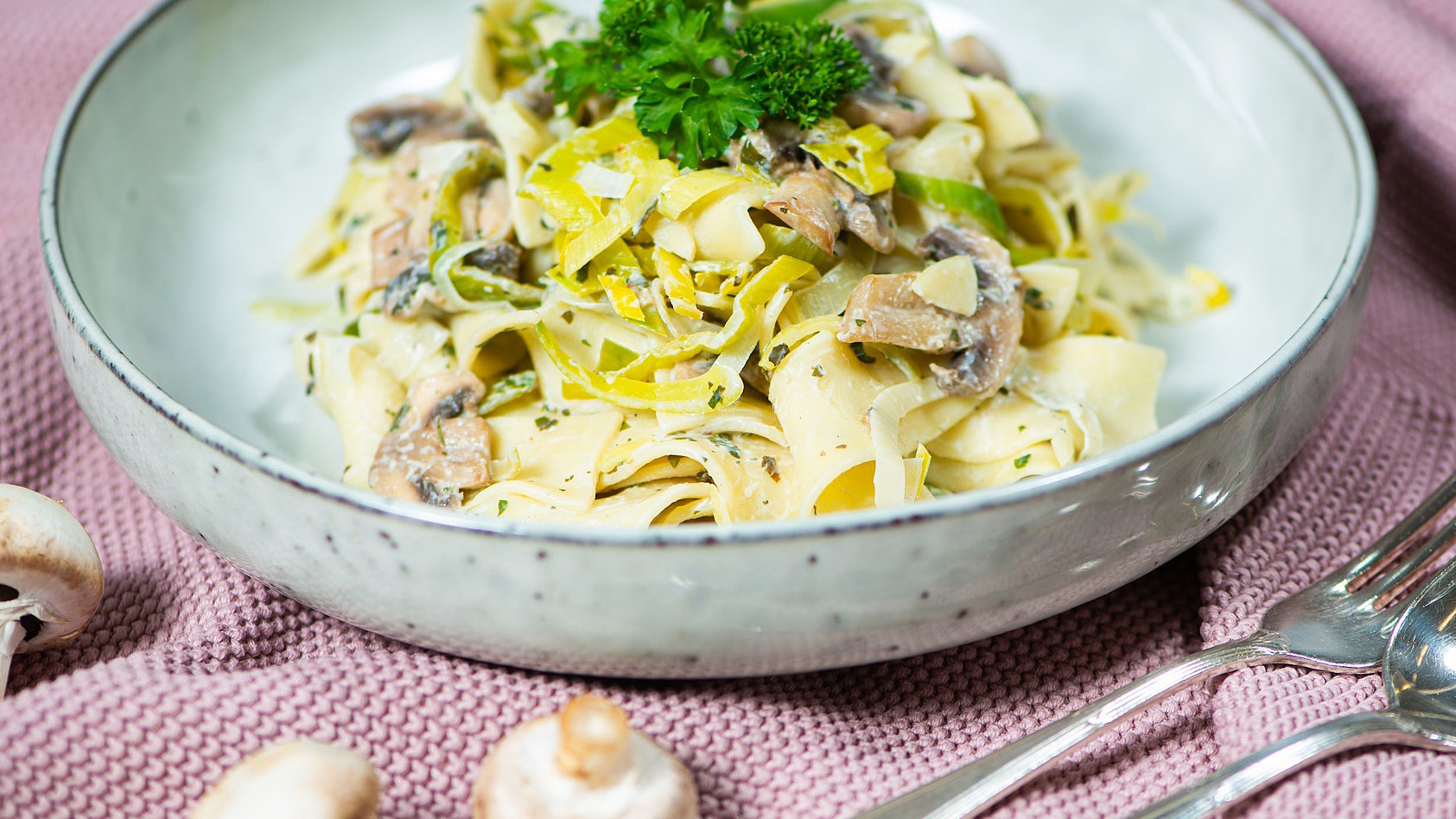 Lauch putzen und in dünne Ringe schneiden. Pilze abbürsten und in Scheiben schneiden. Kräuterblätter abzupfen und grob hacken.