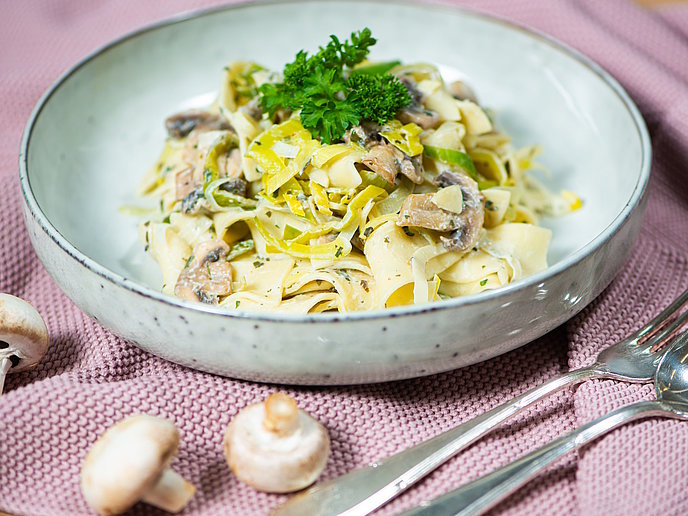 MCT Öl 77 % in einer Pfanne erhitzen, Lauch darin kurz andünsten, Pilze dazugeben und 2 Minuten mitbraten.
