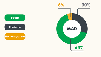 Die modifizierte Atkins Diät ist eine fettreiche Diät, bei der die tägliche Kohlenhydratmenge festgelegt wird (Kinder: 10 g /Tag, Jugendliche und Erwachsene: 15 g /Tag, mit schrittweiser Erhöhung auf 20-30 g /Tag nach Erreichen der Ketose). Der Großteil der Tagesenergie (> 65 %) sollte aus Fett stammen. Kohlenhydrate können zusammen mit Fett zu jeder Tageszeit verzehrt werden. Die MAD gilt im Vergleich zur klassischen Ketogenen Diät als weniger restriktiv und macht eine abwechslungsreichere Nahrungsauswahl möglich (10).