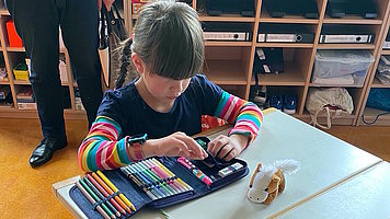 Da es nur wenige Schulen mit dieser besonderen Förderung gibt, ist die Entfernung zum Wohnort etwas größer. Jeden Morgen wird Antonia daher um kurz vor 7 Uhr von einem Fahrdienst abgeholt. In der Schule angekommen, wird zuerst gemeinsam gefrühstückt.