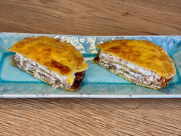 Ja, bekommen sie und ja, Elisa bringt das Essen mit, das wir zubereitet haben. Heute zum Beispiel bekommt sie zum Frühstück ein Brot mit MCT-Margarine und einer Mischung aus KetVit und Haselnussmus, das Verhältnis ist etwas höhere als 2:1. Das Brot backen wir entweder selbst aus einer Low Carb Backmischung, oder kaufen es als Fertigprodukt. Meistens ist in der gleichen oder einer zweiten Dose ein Snack für zwischendurch, mal Nüsse, mal Schokolade oder eine Waffel, nur falls Elisa das Frühstück nicht so mag. Gelegentlich isst sie das Frühstück und einen Teil der Zwischenmahlzeit und bringt dafür einen Teil des Mittagessens wieder mit, den Rest isst sie dann manchmal noch am Nachmittag. Heute gibt es zum Mittagessen eine „Torte“ aus Pfannkuchen geschichtet mit Crème fraîche und fein gewürfeltem Lachs. Die Crème schmecke ich mit etwas Zitronensaft, Salz und Pfeffer ab.