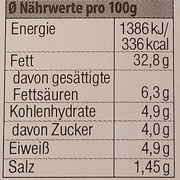 Ketogene Ratio: 32,8 g Fett / (4,9 g Kohlenhydrate + 4,9 g Eiweiß) = 3,3:1