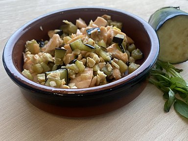 - Auberginen und Lachs würfeln und in einer antihaftbeschichteten Pfanne mit MCT Öl 77% braten.