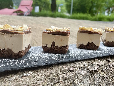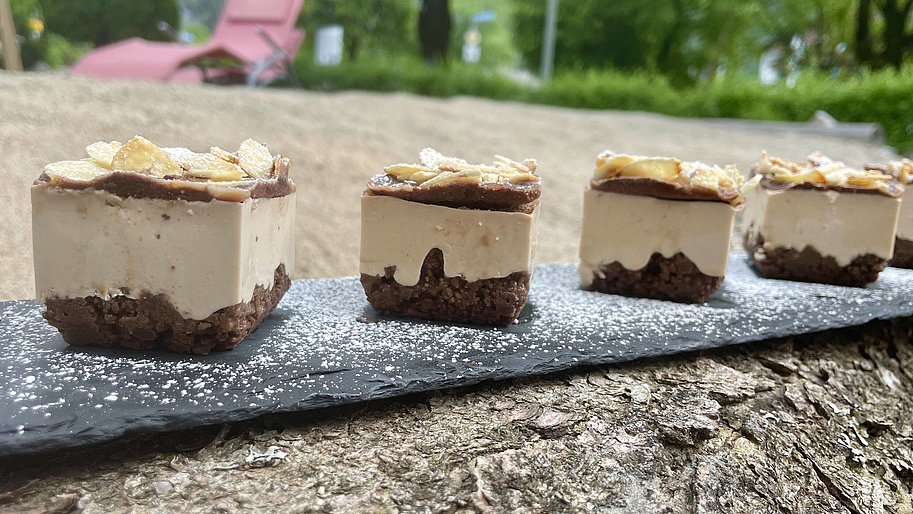 - MCT Cacao Bar schmelzen und auf den Bites verteilen.