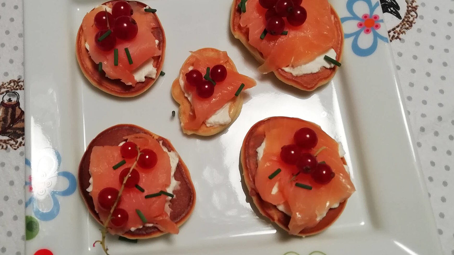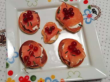 - Die Blinis mit Frischkäse bestreichen, mit geräuchertem Lachs belegen und mit Johannisbeeren verzieren.