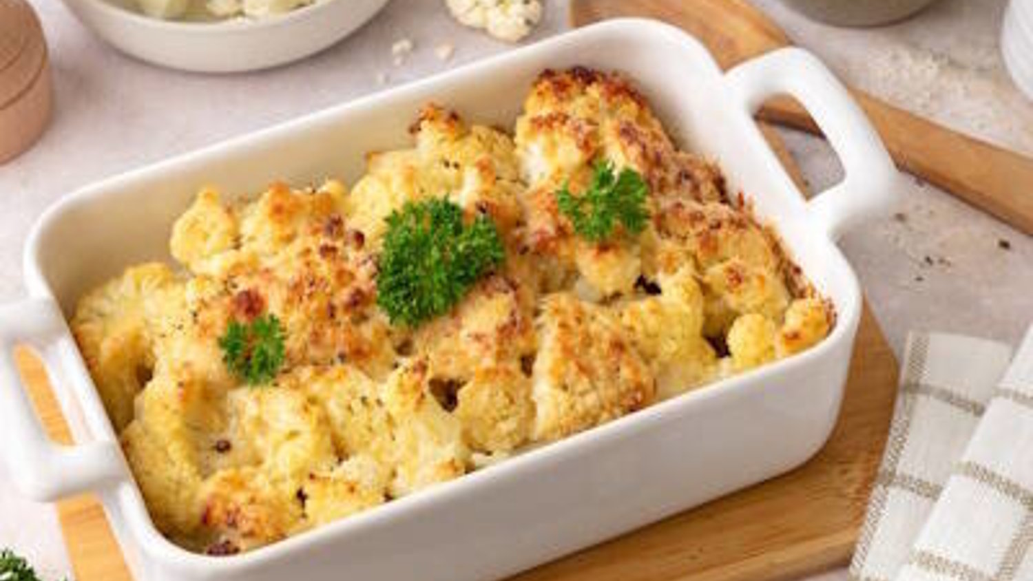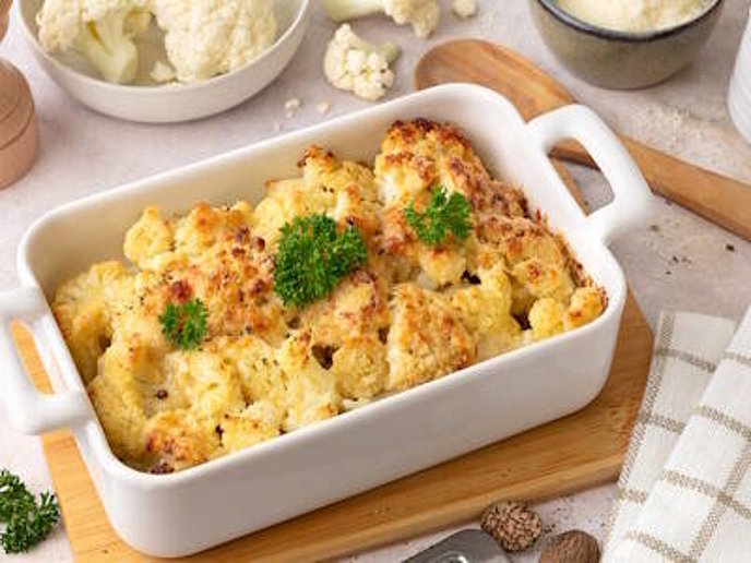 - Sauce über den Blumenkohl gießen und danach mit dem Parmesan bestreuen.