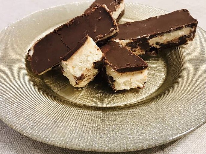Tipp: Die einzelnen Riegel können sehr gut eingefroren werden und dann z.B. auch als Eisriegel serviert werden.
