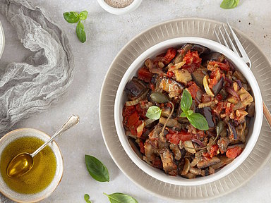 - Fenchel und Zwiebel in 10 g Olivenöl bei mittlerer Hitze kurz anbraten. Knoblauch, Tomaten, Auberginen und Oliven untermischen und noch ein paar Minuten weitergaren. Mit Salz, Pfeffer und dem Essig abschmecken, 1 Beutel MCT Fiber einrühren.