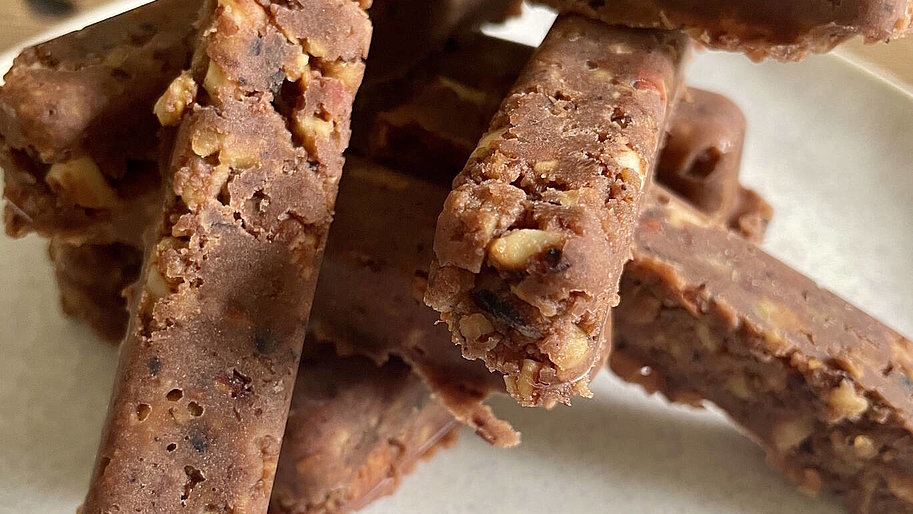 - Die Mischung in eine Silikon-Riegelform drücken und im Kühlschrank fest werden lassen.