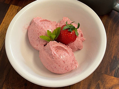 - Gefrorene Erdbeeren mit Erythrit und Limettensaft im Mixer fein hacken.