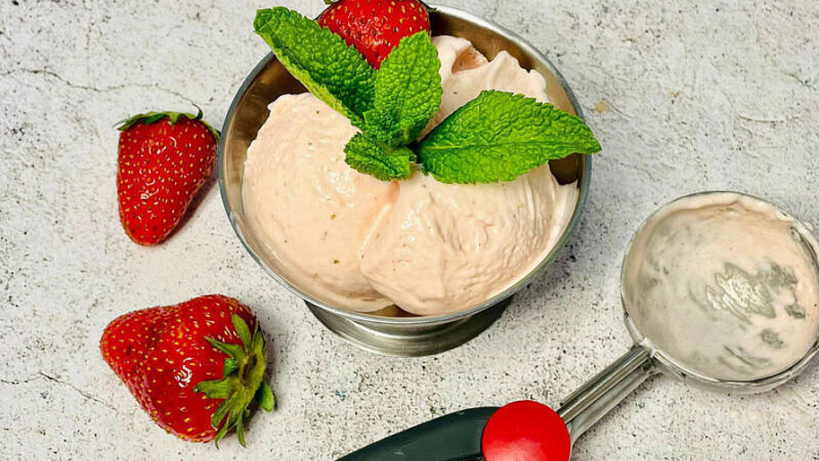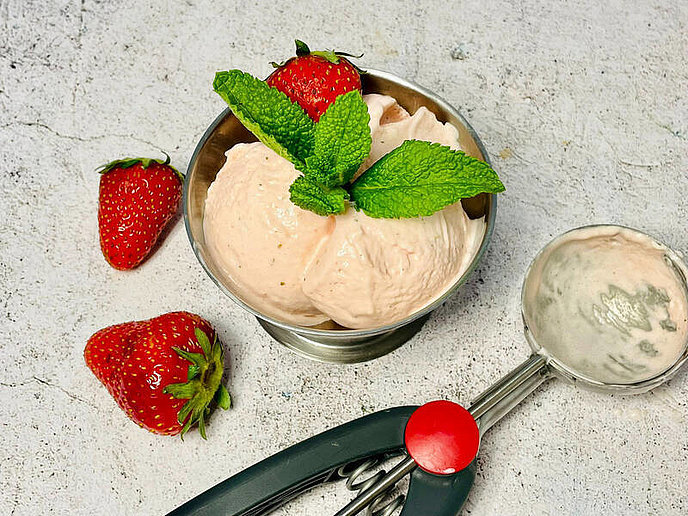 - Zu guter Letzt das Fruchtpüree unter die Creme heben und die Masse für circa 30 Minuten in die Eismaschine geben und gefrieren lassen. Falls keine Eismaschine vorhanden ist, kann die Eismasse in einer Plastikschüssel mit Deckel ins Gefrierfach gestellt und alle 30 Minuten durchgerührt werden. Das Rühren verhindert, dass sich große Eiskristalle bilden. Je kleiner die Eiskristalle sind, desto cremiger wird das Eis