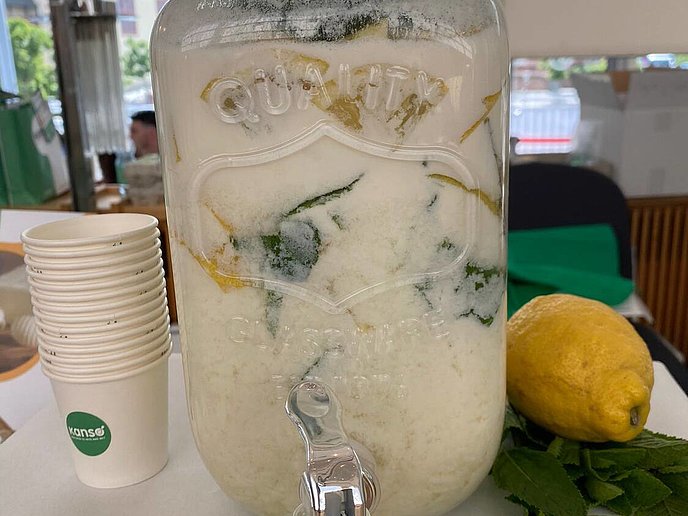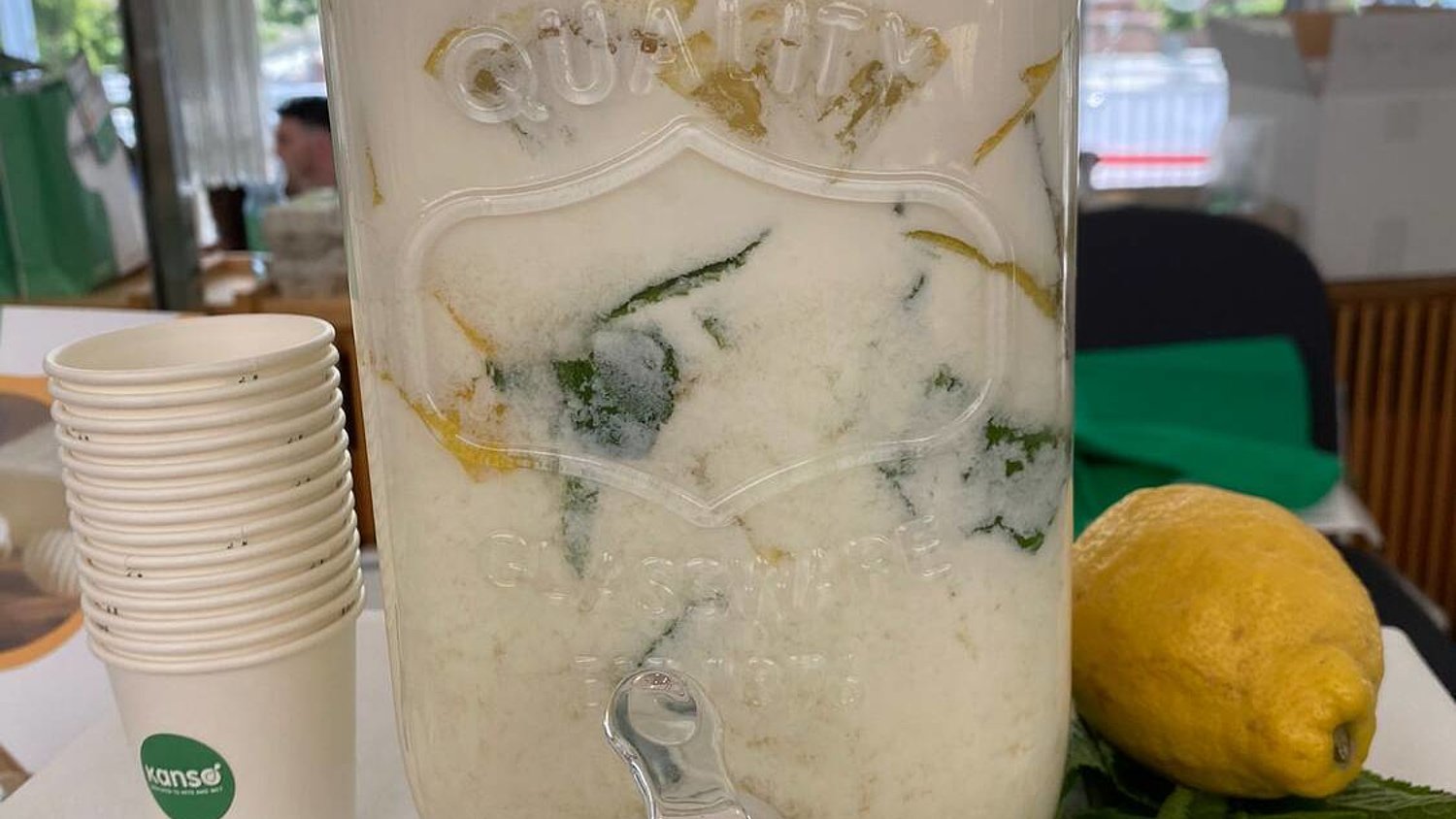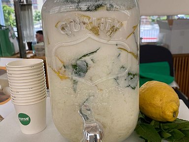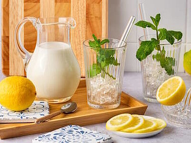 - Nach Bedarf Eiswürfel in eine Karaffe oder einen Limonadenspender geben, nach Belieben Zitronenscheiben und ein paar Stängel der Minze hinzugeben und die angerührte Limonade darauf gießen.