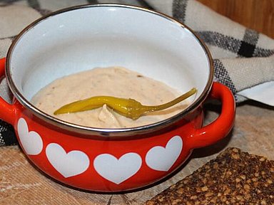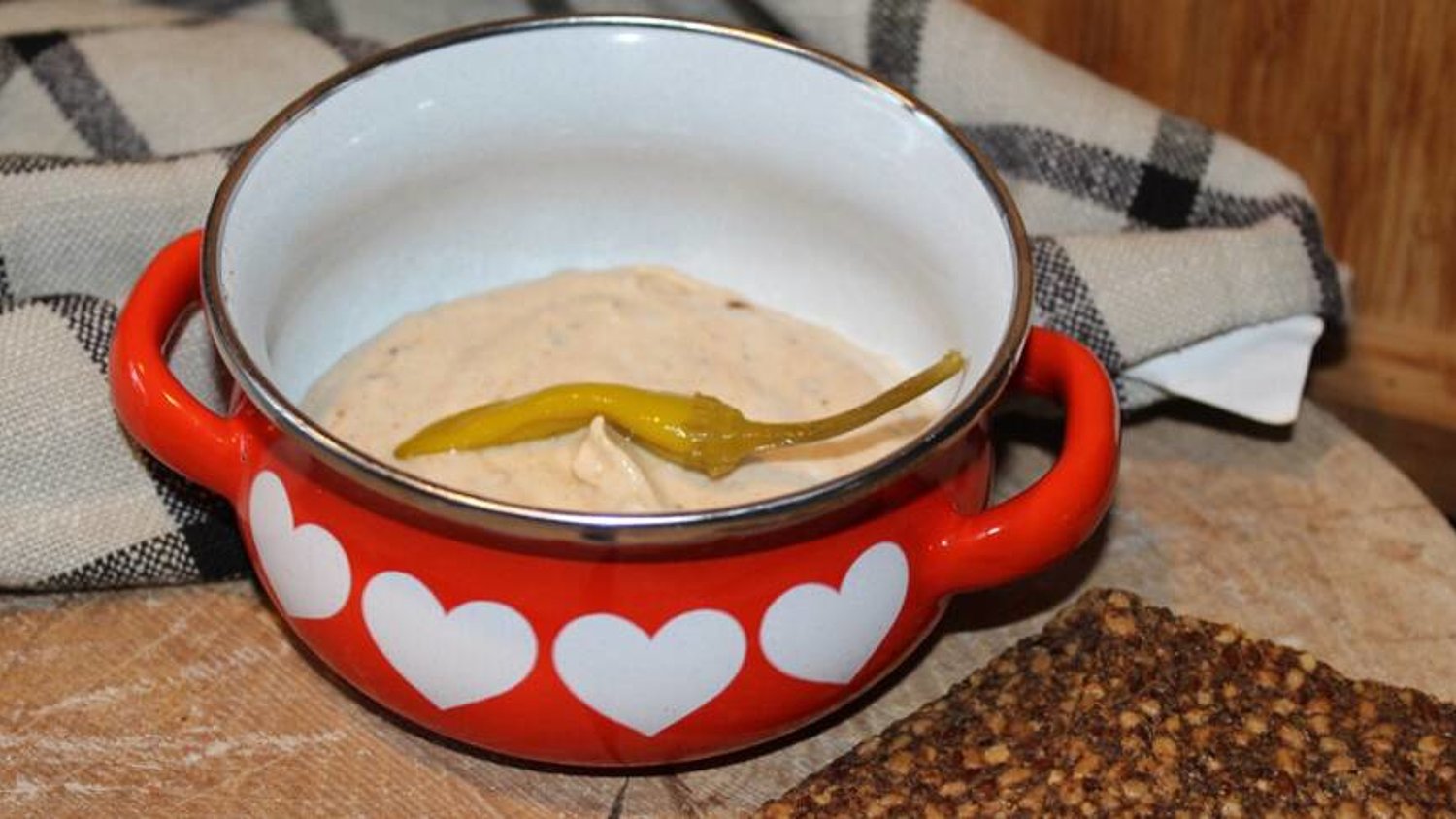 - Zum Schluss 2 TL Chiliflocken in einem Stößel zerkleinern und zu dem Dip hinzugeben. Alles noch einmal verrühren und servieren.