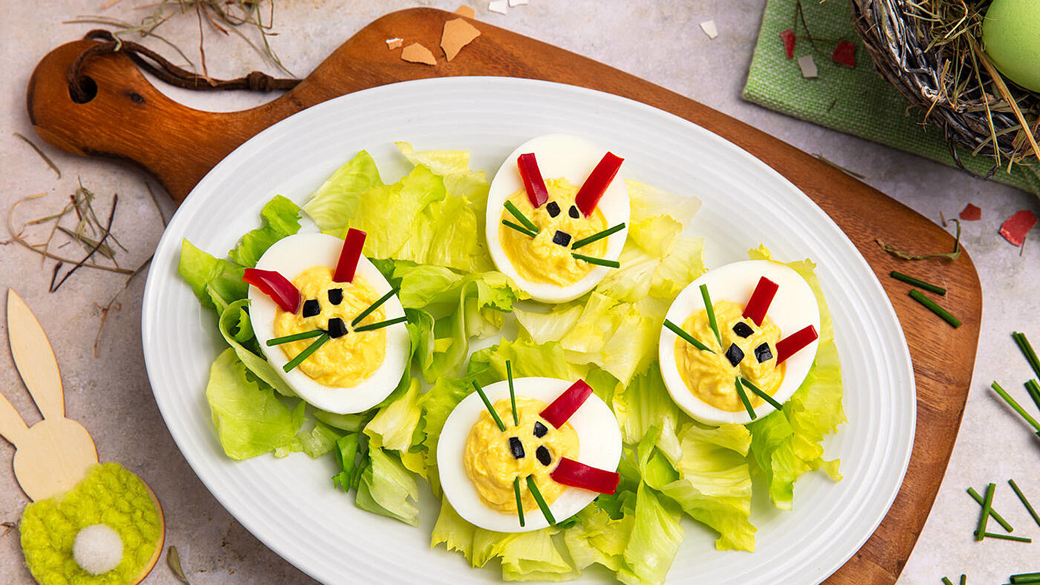 - Die Masse in einen Spritzbeutel füllen und in die Eierhälften spritzen.