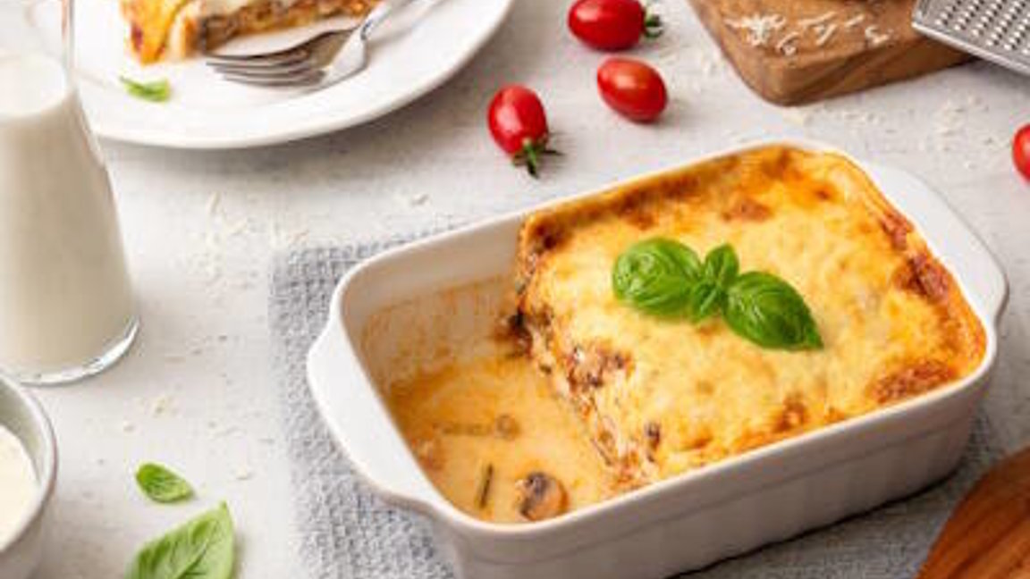 - Im Ofen auf mittlerer Schiene backen, bis die Oberfläche schön gebräunt ist. Mit Basilikum garnieren.