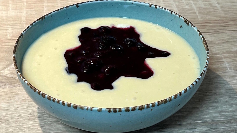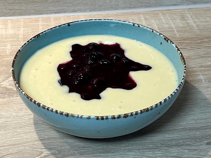 - Mandelmilch in einen Topf geben und mit 1 Beutel* Keto Biota, Ei und Johannisbrotkernmehl unter ständigem Rühren aufkochen. Den Topf zur Seite stellen und die Masse abkühlen lassen.