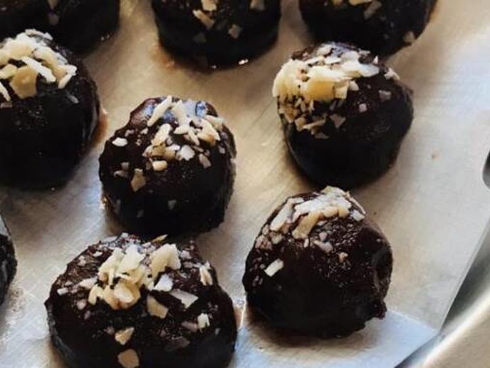 - Die Kugeln in die Schokolade geben, gleichmäßig überziehen, vorsichtig mit einer Gabel entnehmen und auf einem, mit Back-oder Pergamentpapier ausgelegten Teller, trocknen lassen.