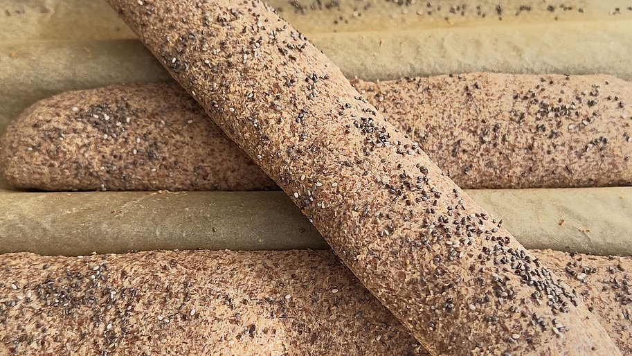 - Für eine knusprige Kruste das Baguette mit etwas Wasser bepinseln und mit Chiasamen bestreuen.