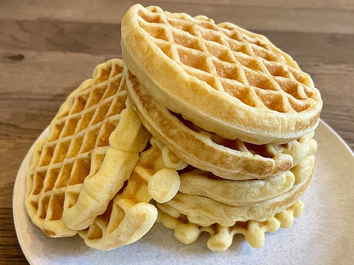 - Teig in einem vorgeheizten Waffeleisen ausbacken, bis die Waffeln goldbraun sind.