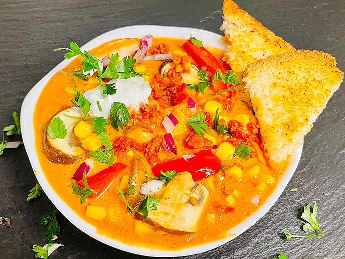 - Anschließend Champignons und Paprika kleinschneiden und zusammen mit dem Mais hinzufügen. Mit den stückigen Tomaten ablöschen und weiter köcheln lassen.