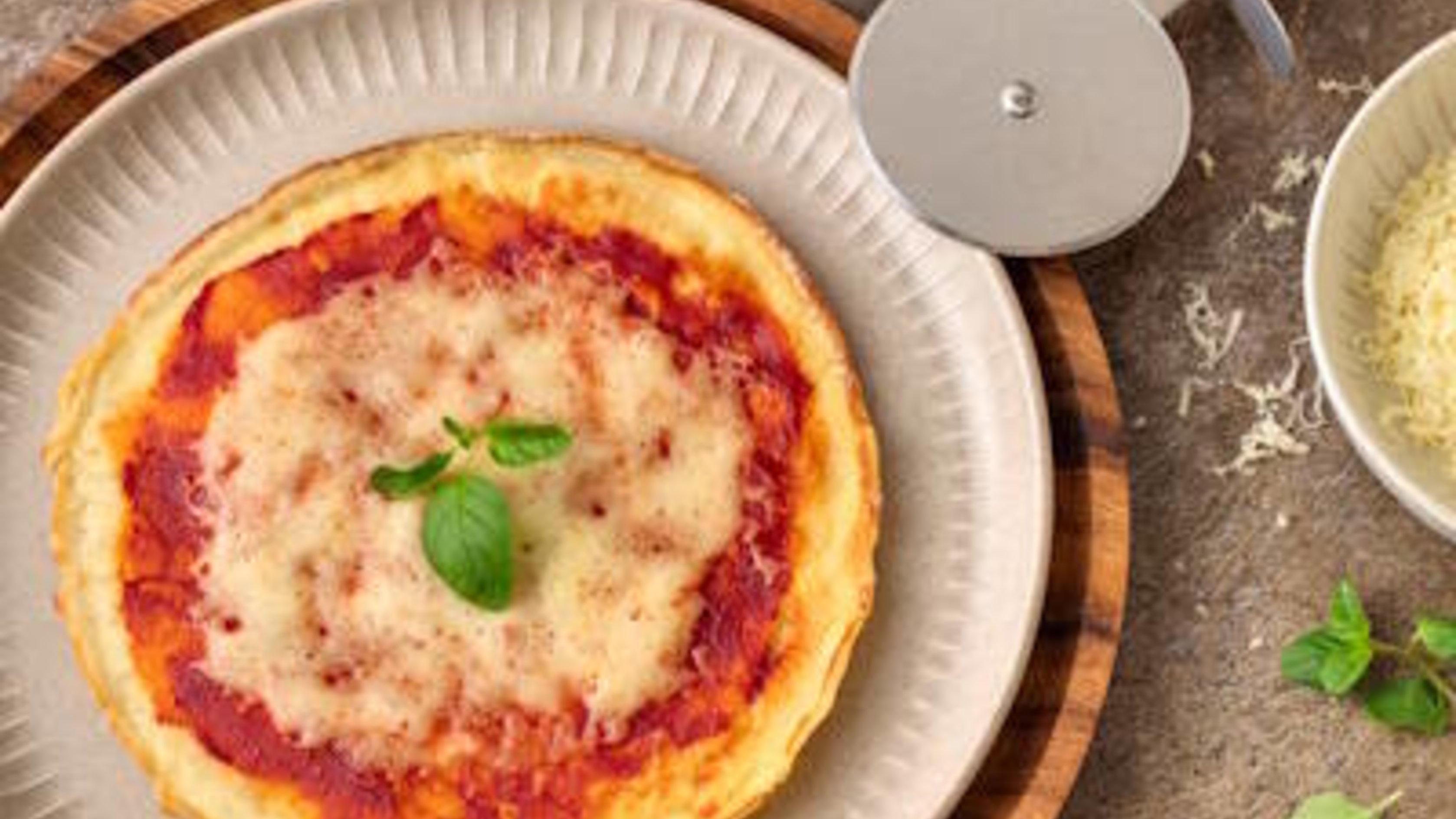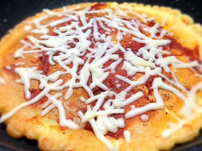 - Rapsöl in einer beschichteten Pfanne erwärmen, den Teig hineingeben und flach streichen zu einem Pizzateig. Von beiden Seiten goldbraun backen.