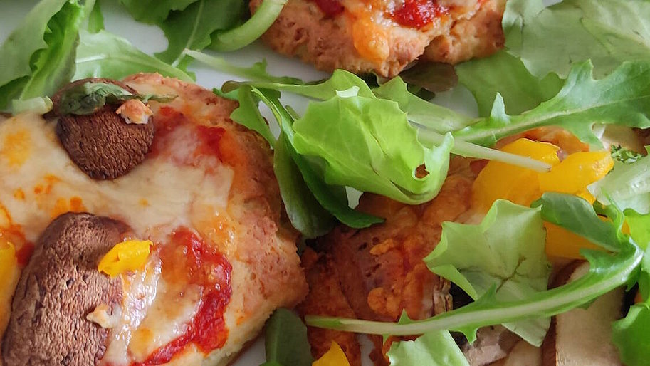 - Für den Teig Keto Baking Mix, 5 Beutel* MCT Fiber, Xanthan, Backpulver und Erythrit in einer Schüssel vermengen. Anschließend Wasser, Olivenöl, Salz, Sojajoghurt und Essig hinzugeben und mit dem Knethaken zu einem gleichmäßigen Teig verkneten. Den fertigen Teig in 8 gleichgroße Stücke teilen und zu Fladen formen.