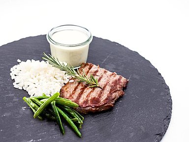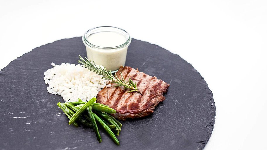 - Reis, Bohnen und Gorgonzolasauce zum Rinderfilet servieren.