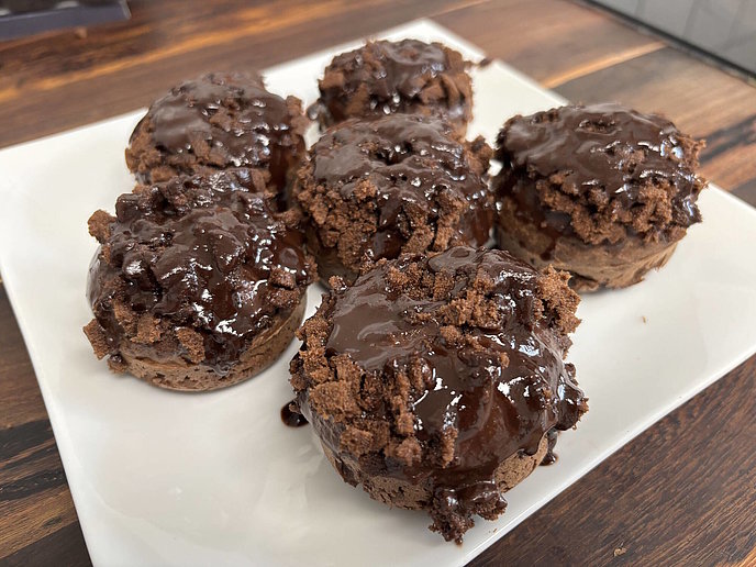 - Donuts in die geschmolzene Schokolade tauchen und mit den zerbröselten Keto Biscuits bestreuen und mit restlicher MCT Cacao Bar beträufeln.
