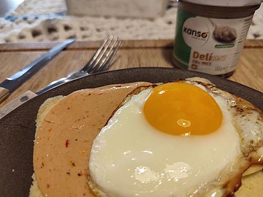 - Die vegane Schinkenwurst auf die mit MCT Margarine 83 % bestrichene Brote legen. Das fertig gebratene Ei auf die Wurst geben und direkt servieren. Mit 10 g MCT Cream kombinieren.