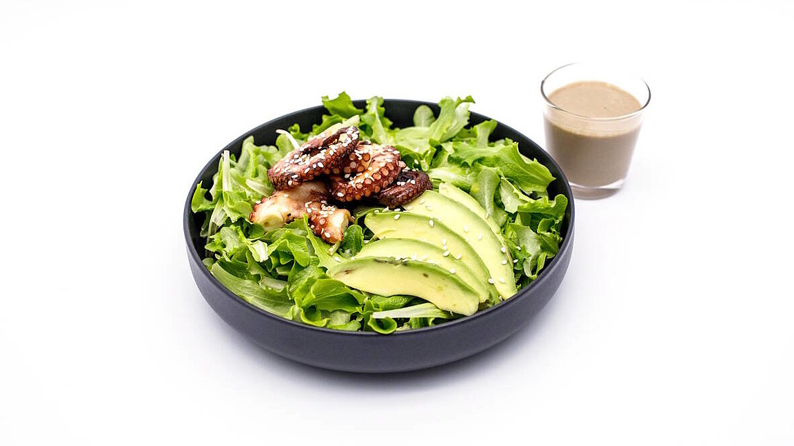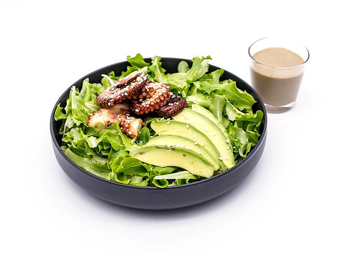 - Den Feldsalat mit der in Scheiben geschnittene Avokado auf einem Teller anrichten, den Tintenfisch oben draufgeben und mit der Senfsoße und Sesamsamen dekorieren.