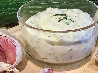 - Vegane Quarkalternative und MCT Öl 100 % mit einer Gabel gut verrühren, Dill, Knoblauch und zum Schluss die geraspelten Gurken unterziehen. Mit Pfeffer, Salz abschmecken.