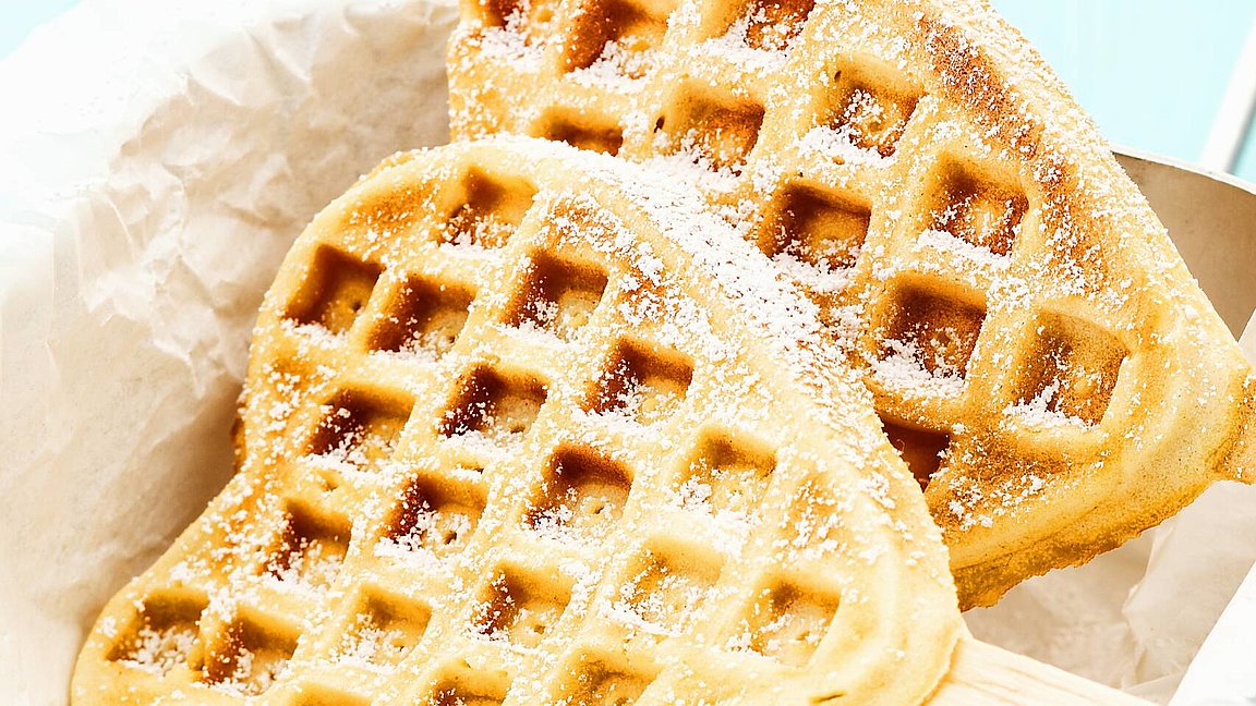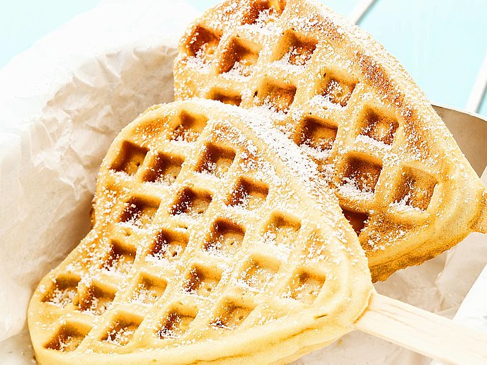 - Das Waffeleisen mit Margarine einfetten und die Waffeln auf mittlerer Stufe goldbraun backen.