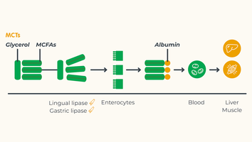 Medium-chain fatty acids (MCTs) have a shorter chain length, which gives them higher water solubility compared to conventional dietary fats (LCT fats). In the intestine, MCT fats passively diffuse into the portal system, even in the absence of digestive enzymes or reduced bile acid production. MCT fats pass from the portal system to the liver, and unlike conventional fats do not require additional transporters making them easier to metabolize (5).