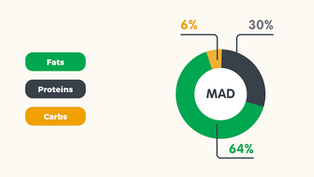 The Modified Atkins Diet is a high-fat diet in which the daily amount of carbohydrates is limited, but it can be slightly increased over time once the body reaches ketosis. The majority of daily energy (> 65%) should come from fat. Carbohydrates can be consumed together with fat at any time of the day. Compared to the Classic Ketogenic Diet, MAD is less strict and allows a wider variety of foods (10).