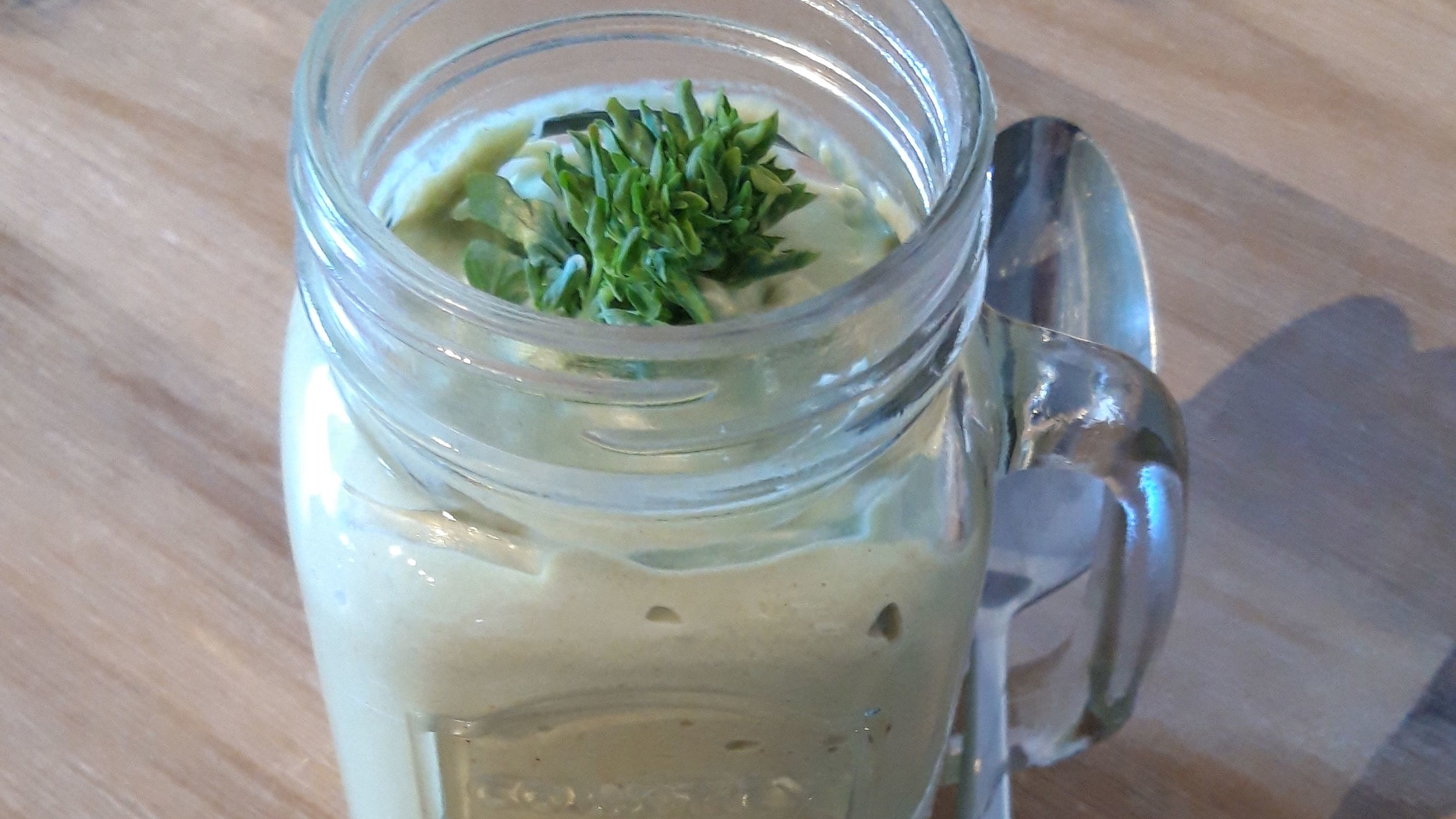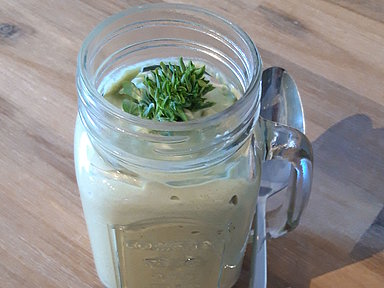 Place avocado, coriander, cucumber, MCTfiber, almond drink and tahini in a blender and blend until smooth.