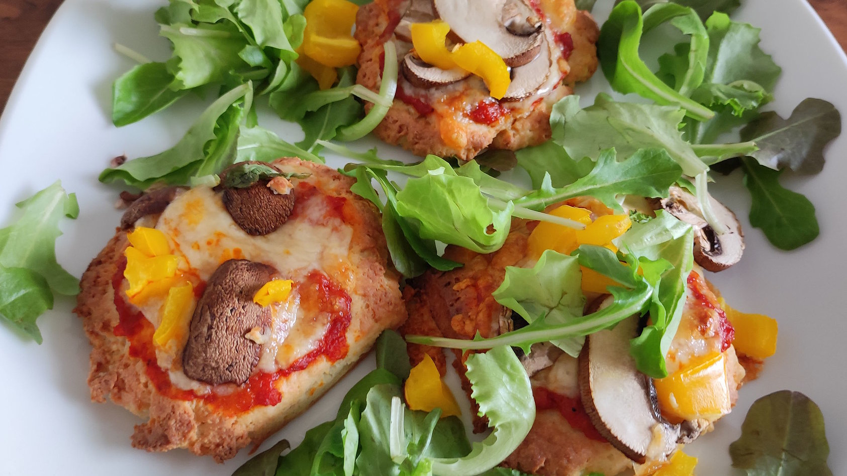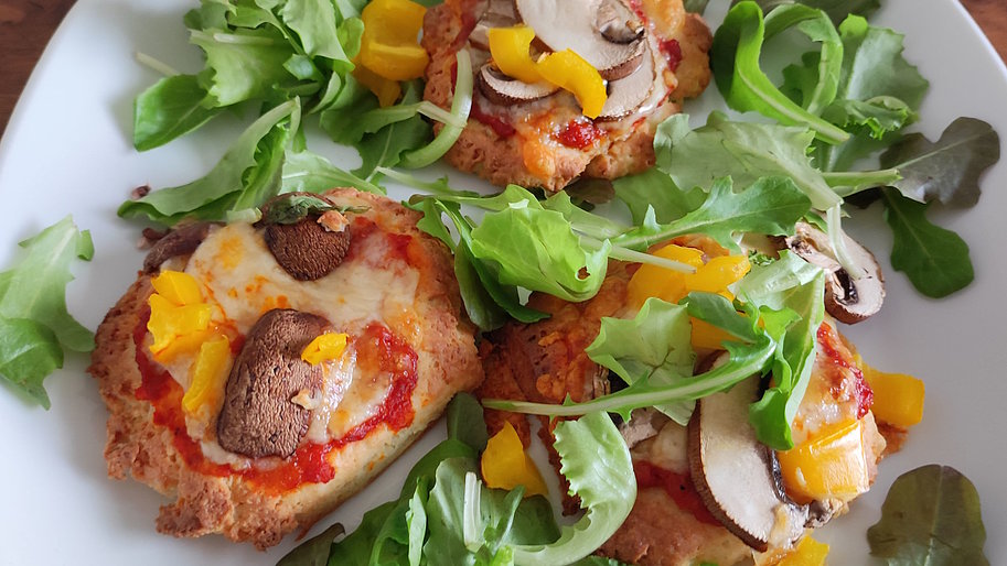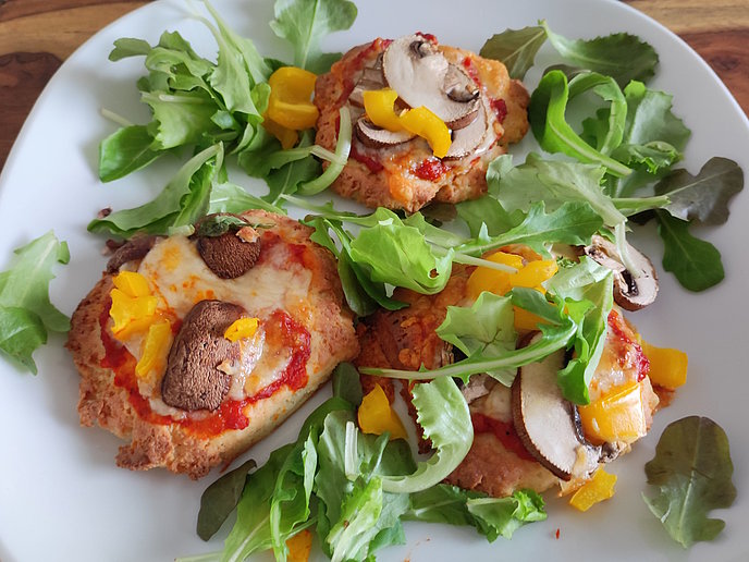 For the dough, mix KetoBaking Mix, MCTfiber, xanthan, baking powder and erythritol in a bowl. Then add water, olive oil, salt, soy yogurt and vinegar and knead with the dough hook until a uniform dough. Divide the finished dough into 8 equal pieces and shape.
