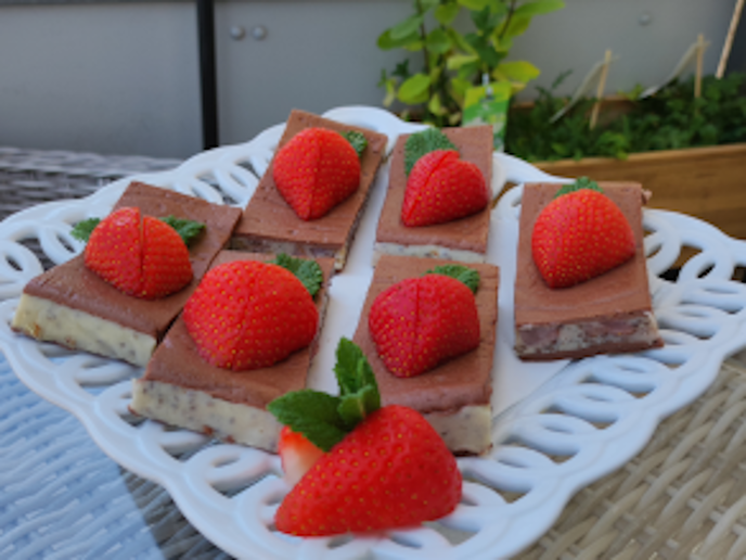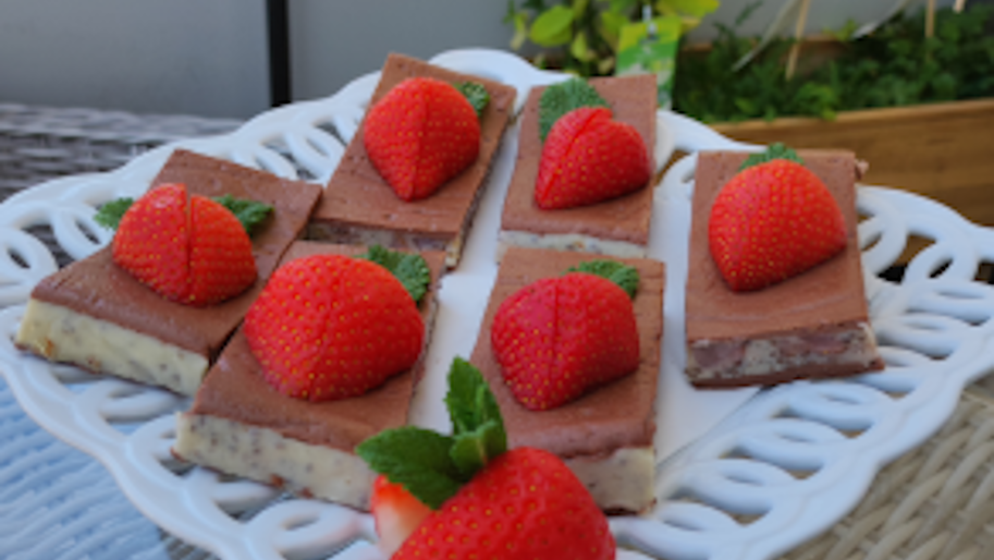 For the filling, mix KetoBiota with water and curd cheese to a creamy mass. Then wash the strawberries, cut into small cubes and add to the mixture together with the chia seeds.