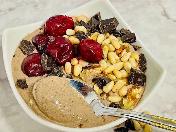 - Tritare le noci e la DelíMCT CacaoBar e usarle insieme ai pinoli di cedro e alle ciliegie come guarnizione.