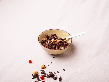 Versa il composto liquido sugli ingredienti secchi e mescola molto bene, cercando di inumidire tutta la granella mista e compattare leggermente dei mucchietti con le mani.
