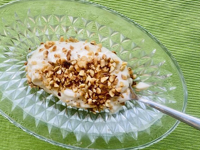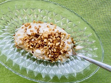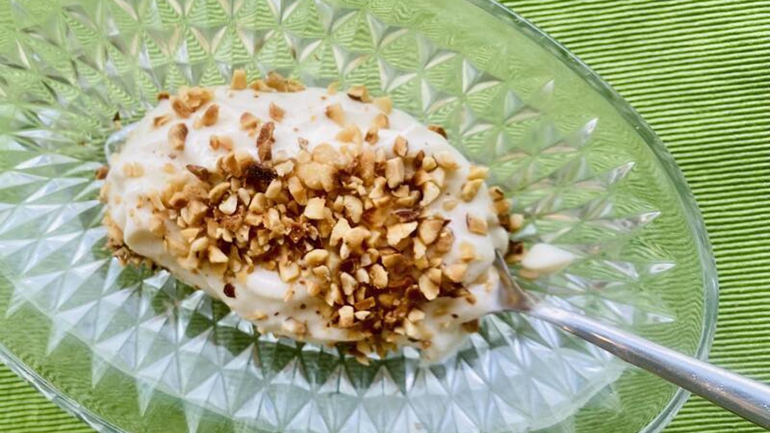 - Prendi la granella di nocciole e spargila sopra la crema. Questa aggiunta croccante darà un tocco finale gustoso alla preparazione.
